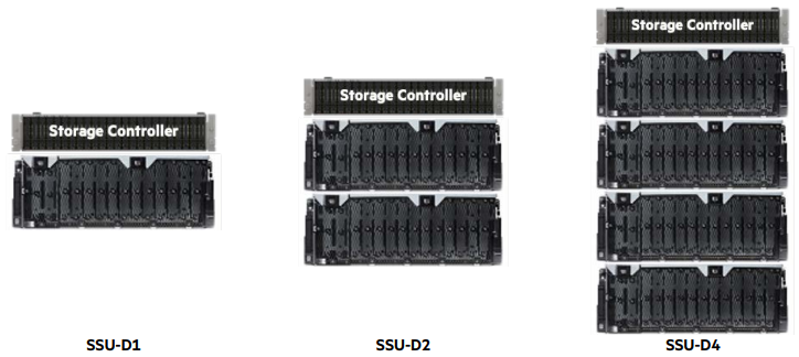 Choose between datacenter friendly SSU-M utilizing 5U84 disk storage enclosure or maximum capacity with SSU-D utilizing 4U106 ultra-dense disk storage enclosure.