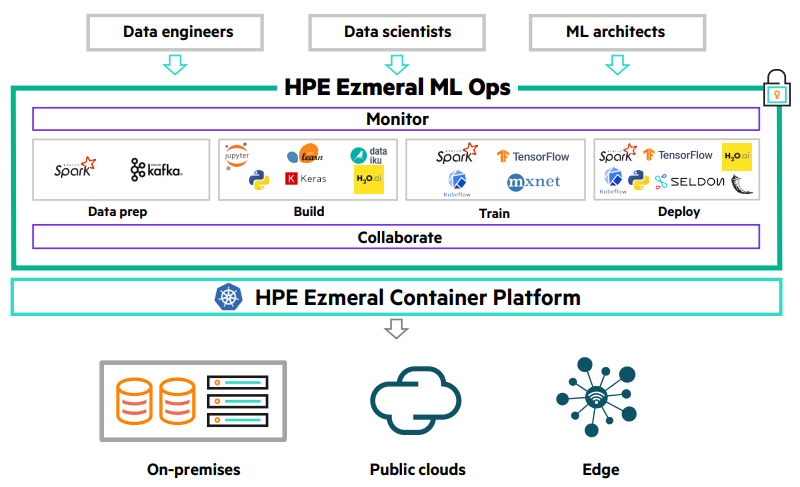 The HPE Ezmeral ML Ops solution supports every stage of ML lifecycle-data preparation, model build, model training, model deployment, collaboration, and monitoring. HPE Ezmeral ML Ops is an end-to-end data science solution with the flexibility to run on-premises, in multiple public clouds, or in a hybrid model and respond to dynamic business requirements in a variety of use cases.