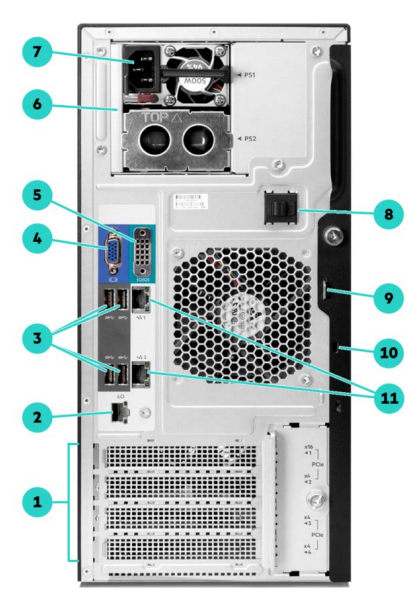 - NIC1/shared iLO port (upper), NIC2 port (lower)