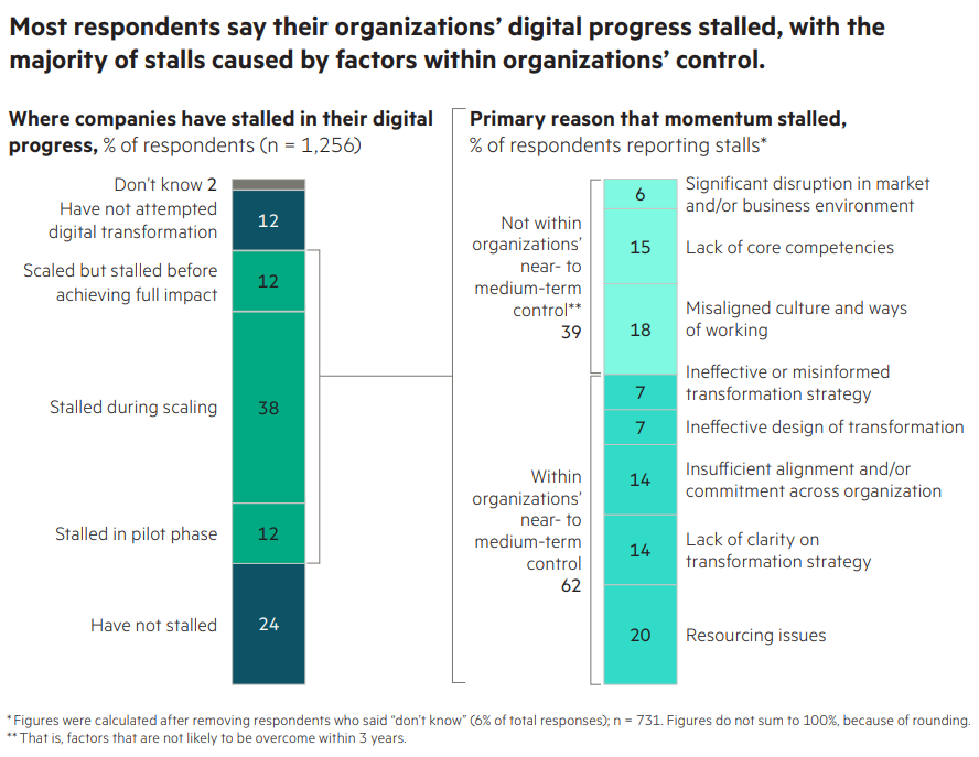In contrast, you can both propel and de-risk your progress by orchestrating your digital initiative landscape more effectively, identifying what to fast track from an initial idea into acting as a building block that other ecosystem improvements can leverage. The caveat being, this has to be driven from the top of the organization. Without a shared ambition and an established guiding coalition, your digital progress will continue to stall and targeted outcomes will be missed.
