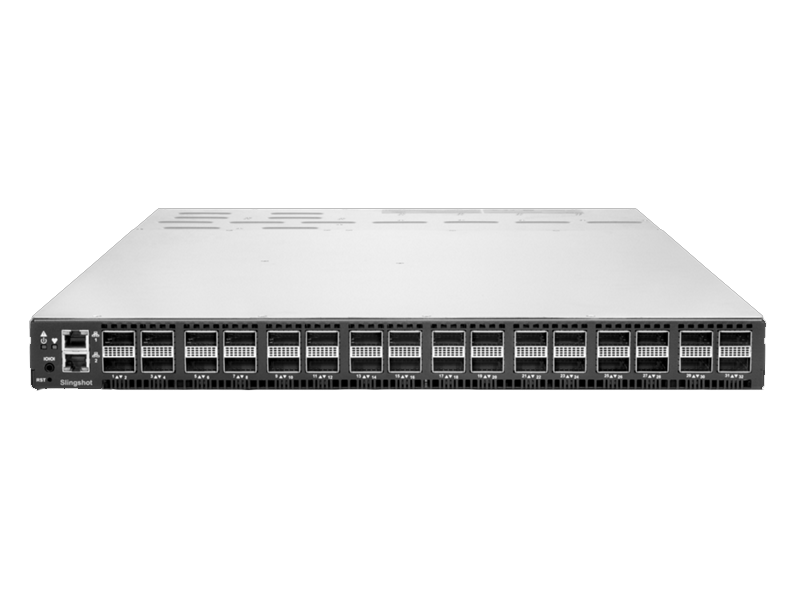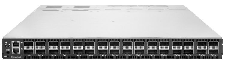 The HPE Slingshot top of rack switch for air-cooled HPE Cray Supercomputers comes in a TOR 19" 1U standard form factor. It has 64 front-facing ports for cabling.